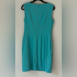 Chic turquoise midi dress with layered skirt. Sleeveless design for versatile wear. Dress has a little stretch for comfort. Excellent pre-loved condition and ready for work, weddings, and more. See photos for measurements and close ups.
