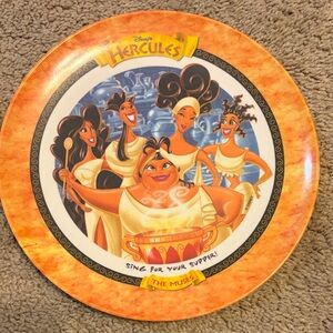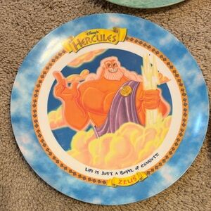 The image displays four vintage plastic plates from the 1997 McDonald's promotional collection for Disney's Hercules movie. Each plate features a different character from the film, including Megara, Hercules, Zeus, and the Muses. These brightly colored, round plates were likely distributed as part of a Happy Meal promotion or a separate collectible series, designed to celebrate the release of Disney's animated film. They serve as nostalgic memorabilia for fans of the movie and collectors of Disney or McDonald's promotional items.