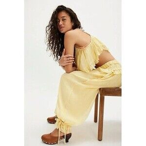 The Free People Lynden Set includes a sleeveless, solid yellow top with a lace flutter design and cropped pants with balloon legs in a relaxed fit. Made from rayon, this 2-piece set is perfect for summer and spring occasions like travel, parties, or casual outings. The bohemian and luxury-themed outfit is ideal for a vacation vibe, offering a comfortable and stylish look for women in size M.