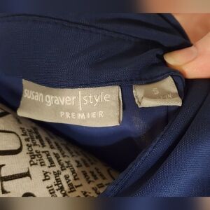 Elegant navy top from Susan Graver. Features a stylish design. The sleeves and upper back are sheer and breathable. The entire shirt is made of a stretchy material, easy to move in, pockets are not real. Very comfortable.