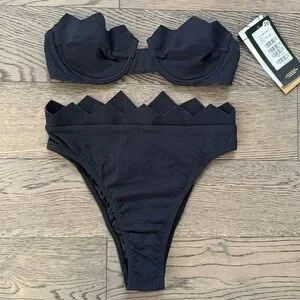 Textured fabric with laser cut zigzag cups on the bandeau top and a matching zigzag waistband on the high waisted hot pants bikini bottom.