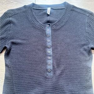 Scoop neck waffle knit thermal from Intimately Free People. Black in color. Snap buttons up the front. Slim fitting silhouette. Rounded hemline. Made of viscose, polyester & elastane.