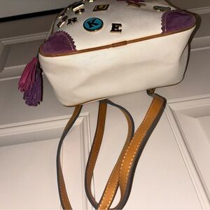Chic Dooney & Bourke backpack in white. Features vibrant patches and pink & purple tassels. Rainbow zipper! Adds a fun flair to any look. Has marks and lines in various places on exterior of bag I photographed the best I could. Unclean interior as seen in photos. I do not clean bag interiors because that is not my expertise. Ask before you buy if thats a concern to you. Condition reflects the great price. Also has some tassle strands missing from purple tassle as shown in images. THIS BAG IS IN PREOWNED CONDITION!!! Please review ALL photos before purchase. Thank you 🥰