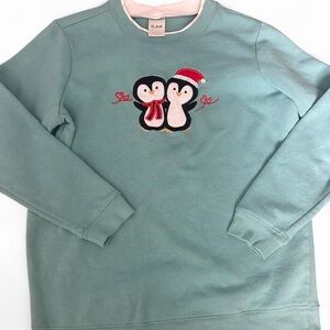 penguin patch, festive sweater, holiday pullover, kawaii design, cozy knit, winter apparel, novelty christmas, adorable penguin, seasonal fashion, cute holiday