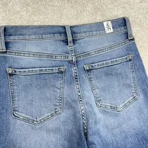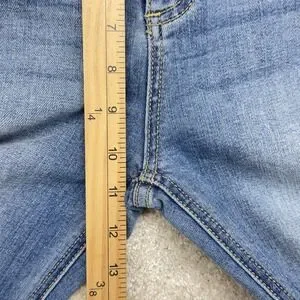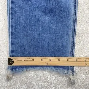 Pre-owned with light wear from normal use and softening of the denim. Fabric is clean and intact with no stains or holes beyond the intentionally distressed knee rips and raw frayed hems as designed. Zipper, button, pockets, belt loops, and seams are secure and fully functional.