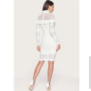 This long sleeve Mixed Stretch Lace Midi dress from Bebe in navy Peacoat blue features a high ruffled neck, fishnet mesh at the yoke, semi-sheer long sleeves, a ruffle across the bust, and a fitted sheath silhouete in striped lace. Lined with a concealed back zipper. Stretchy and flattering! 53% Cotton, 45% polyamide, 2% spandex. Model is 5'9" and wears a US size S