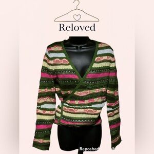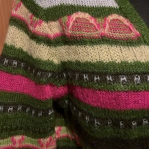 V-neck sweater with vibrant stripes. Features green, pink, and cream colors. Perfect for casual wear.