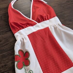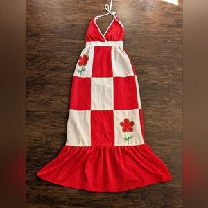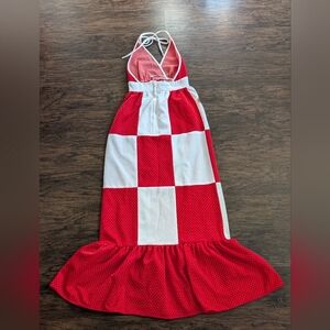 Vintage 1970s PBJ by Jerell summer dress size 5. Red and white polka dot maxi dress with floral patch/ embroidery, low back and halter neck maxidress. Beautiful dress perfect for spring and summer during picnics, vacation, everyday and other occasions. Due to being used and vintage it does have pullings, and may have stains ( none noticeable). Sold as is.