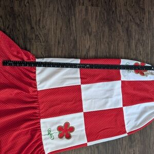 Stylish red and white checkered maxi dress with floral embroidery. Perfect for summer outings.