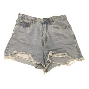 Trendy distressed jean shorts. Perfect for casual wear. Classic blue denim look.