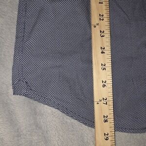 The Vince Long Sleeve Button Down Shirt in size Medium features a blue polka dot all over print, making it perfect for casual occasions. Made of lightweight cotton, this collared shirt with a button-down style is machine washable and easy to care for. The regular fit and chest size of 40 inches make it a comfortable and stylish choice for men looking for a versatile addition to their wardrobe. Ideal for the seasons of winter, fall, and spring, this shirt is a fun and trendy option for everyday wear.