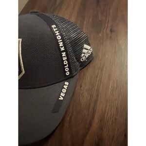 Black adidas hat features the golden knights "spartan helmet" logo on the front with a stripe up the side with their full team name written out. Hat is new. The inside brim has a line at the bottom. It is NOT A sweat line. Hat has never been worn before. Adidas logo on the side of the hat and the NHL shield on the back. Ships within 1 business day. Offers always welcome