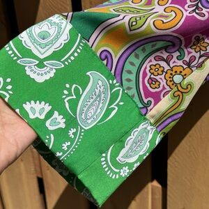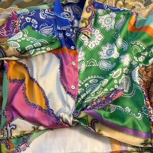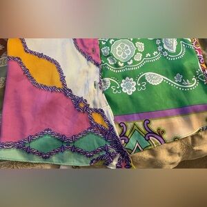 Condition: Item is preowned, in good condition, laundered, gently loved. No holes. Light stains as noted, not visible when you tie in a knot in front. I tried it before listing.