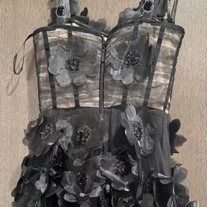 Stunning black dress with floral embellishments. Perfect for special occasions. Worn only for a few hours. Extra flowers available if you wanted to add . Missing flower pictured area, can easily be put back.