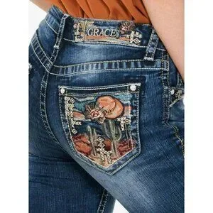 The Grace in LA women's bootcut jean in Easy Fit shows off your best shape by featuring a higher rise. The denim fabric features a softer and higher stretch for exceptional comfort all while maintaining a denim look. The mid-rise creates a form-flattering fit for every curve. The jean is detailed in a cactus embroidered design on the back pockets, added embellishment on the front pockets, natural hand-sanding, and whiskering. Western look and desert vibes!