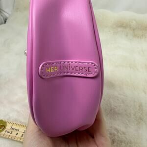 Stay sweet and kawaii with this Her Universe Hello Kitty Heart Shoulder Bag! This stunning accessory is a pink dream, featuring a pearlescent bead overlay and a playful winking Hello Kitty printed right on the corner. The center is anchored by her iconic embossed bow, giving it that perfect Sanrio touch. It comes loaded with cute extras, including a removable key chain featuring a heart-shaped mirror and a Hello Kitty charm for on-the-go touch-ups. With a secure top zipper closure and an interior drop pocket, it’s as functional as it is adorable. Measuring 11" x 7", it’s the ideal size for your phone, wallet, and lip gloss. Whether you're channeling Barbiecore or soft girl aesthetics, this bag is a total standout for any collector.