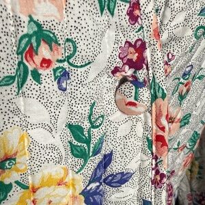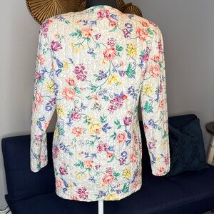 This vibrant floral women's jacket features a colorful design perfect for adding a pop of color to any outfit. Ideal for casual outings or a stylish layer. Vintage style, with shoulder pads, and fabric button detail- GUC without rips, or stains. No size or material tag found. Approximate fit S/M. (See photos for P2P and length flat lay measurements).