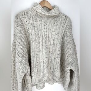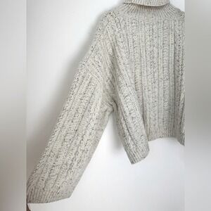 TOTEME cable knit turtleneck in a heavyweight wool blend. It's designed for a relaxed fit and shaped to a cropped, boxy silhouette with ribbed edges, wide sleeves with dropped shoulders, and twisted seams along the sides. Team it with high-waist pants