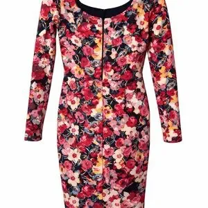 Beautiful fitted silhouette with vibrant red, pink, yellow, and ivory florals on a dark background. Super flattering stretch fabric with long sleeves, scoop neckline, and hidden back zipper. Perfect for weddings, parties, date nights, or special occasions.