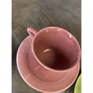 utensil marks, small hairline on green saucer, small chip on pink cup