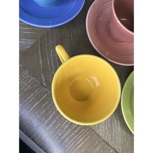 Homer Laughlin China - Harlequin 4 Cups 3 Saucers - Chartreuse Yellow Blue Rose Turquoise