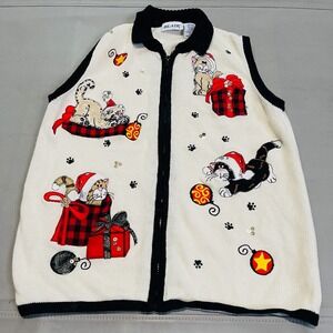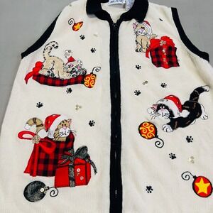 VTG BLAIR Women Ugly Christmas Xmas Crazy Kitty Cat Sweater Lady L White-4271