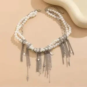 Bold, elegant, and fashion-forward, this layered pearl and chain choker necklace is a stunning blend of classic and edgy styles. Featuring a mix of faux pearls, silver-tone chains, and dangling charms, this piece creates a unique contrast between sophistication and modern grunge. Perfect for adding a statement touch to any outfit, whether dressing up or elevating your everyday look.