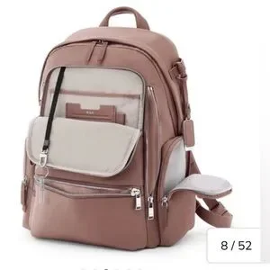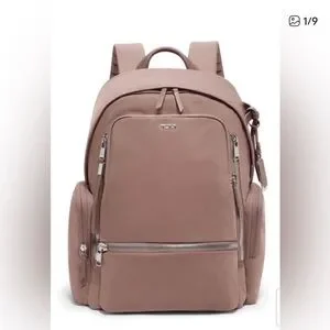 Stylish Tumi backpack in rose with sleek silver details. Ideal for everyday use. Added more pictures