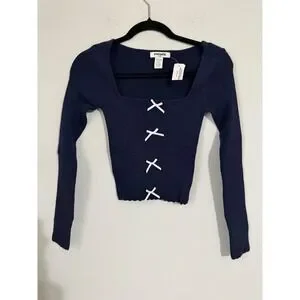 Elevate your wardrobe with this charming RSQ cropped sweater, a delightful blend of cozy comfort and playful style. The deep navy blue hue offers a sophisticated base, while the ribbed texture adds visual interest and a flattering fit. Unique white corset lacing across the neckline creates a captivating focal point, drawing the eye and adding a touch of vintage-inspired charm.