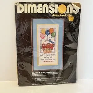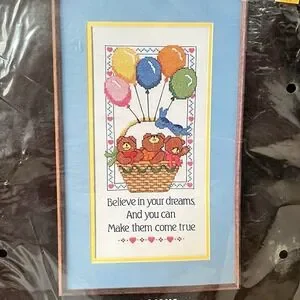 Themis is a vintage Dimensions Believe In Your Dreams Stamped Cross Stitch kit featuring teddy bears and balloons with cottagecore theme. It is made by the brand Dimensions in the United States. The kit includes everything needed for cross stitch embroidery, making it easy for crafters to create a beautiful and charming piece with a nostalgic touch. Perfect for those who enjoy working on hand embroidery projects and love toys, dolls, and bears designs.