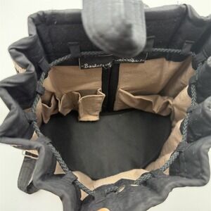 This Baskets of Cambodia woven straw bucket backpack is the kind of bag that instantly makes an outfit feel pulled together. Natural tan with black trim and silver-tone hardware, it cinches closed with a drawstring and bead accents for an easy, secure finish. Medium size (12"W x 11"H) with a fabric-lined interior, inner pockets, and organizer to keep essentials in place. Perfect for brunch, beach days, festivals, and travel. Condition: pre-owned.