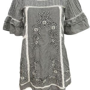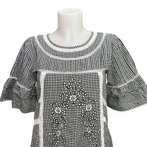 Free People Sunny Day Trapeze Shift Dress Gingham Black Floral Embroidered sz XS