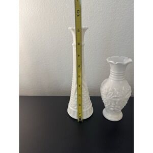 2 white glass vases