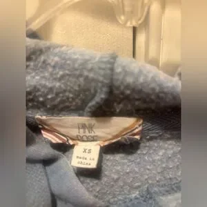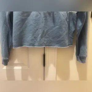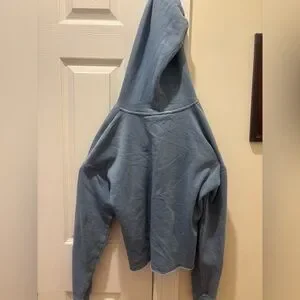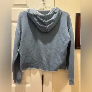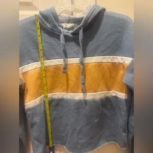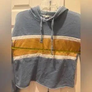 Women’s/Teen Stylish cropped blue hoodie with a mustard yellow and creme stripe across front. Frayed bottom hem design. Comfortable and trendy. Lightweight.