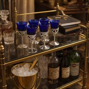 Beautiful set of six vintage Nikko Japanese cordial or saki glasses featuring striking cobalt blue glass inserts held within ornate chrome dragon-themed stems.