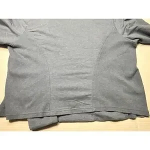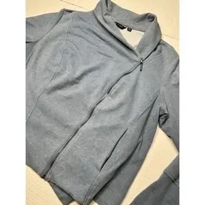 H by Halston women's asymmetrical zip front knit jacket blazer in blue, size 22W plus size. Soft cotton blend stretch fabric with moto-style angled zipper closure, ribbed side panels for shaping, long sleeves, structured collar, and lightweight sweatshirt feel perfect for casual or work layering. Flattering fitted silhouette with modern edge.