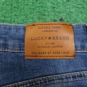 Tag details: Inner labels show Lucky Brand Los Angeles, California branding, size 6 / 28, style name Bridgette Skinny, fabric content, and Made in China; back waistband leather patch reads Durable Goods Handcrafted Lucky Brand The Mark of Good Luck.