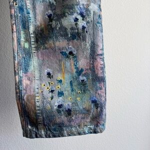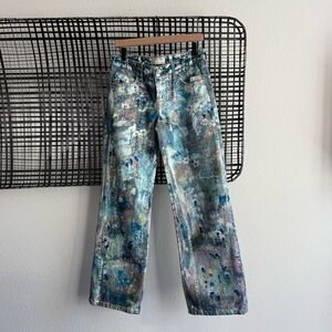 Features: Button fly closure, five-pocket design, screenprinted paint design