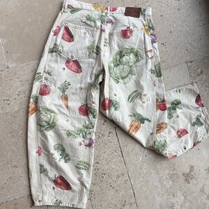 Fun barrel jeans with veggie design. Features button-fly closure. Perfect for a stylish look.