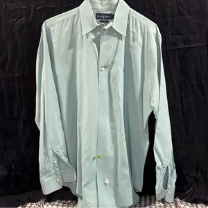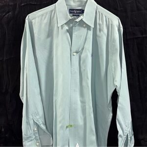 Stylish Ralph Lauren dress shirt in aqua. Ideal for any occasion. Comfortable and elegant. There is a hard like stain on inside cuff on left arm