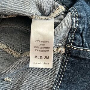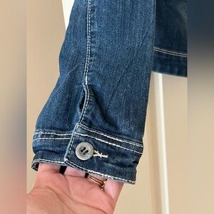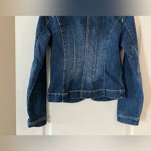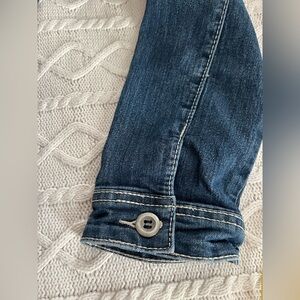 EUC excellent condition & quality! Chic jean jacket with stylish button accents. Ideal for everyday wear. Button cuffs. Distressed. Cotton, polyester & spandex blend. Measurements in photos. Smoke free home. Women’s size medium