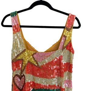 Multicolored sparkling sequin mini dress with a fun heart and star pattern. Has a deep V neckline and scoop back. UK 10 / US 6