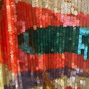 ** New with tags but has several spots on front and back with pulled and loose threads and missing sequins. See photos.