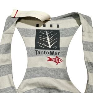 Pre-loved women’s Tanto Mar mix media print linen jersey lagenlook midi dress. Features a jersey stretch knit top half, linen skirt, racer back, and shelf bra support.