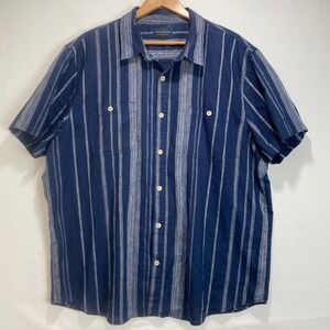 Lucky Brand Linen Blend Stripe Short Sleeve Button Up Mens XL Navy White Shirt