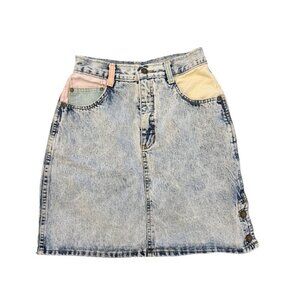 Channel retro charm with this vintage-inspired denim mini skirt from Hollywood Era! This high-rise acid wash skirt features playful pastel colorblock pockets and belt loops, plus a flattering A-line silhouette. It’s finished with metal side snaps and a zipper fly for that classic 90s feel.
