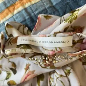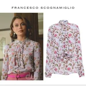 Stunning! Celebrity Italian Designer Francesco Scognamiglio. Blouse is like new. Absolutely no flaws. A gorgeous piece. Bejeweled neckline. Ruffle bow in front. Keyhole in back Italian size 42 = approx. size medium or size 6/8 but please see measurements. Viscose. Floral. Sold for $660 retail! Color is a light cornflower blue. Made in Italy.