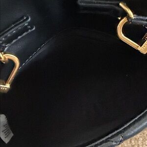 The classic black exterior is elevated with delicate studded gold flower accents, creating a sophisticated, feminine touch inside, the bag is lined with soft cotton fabric and includes a small interior pocket for added organization and functionality.