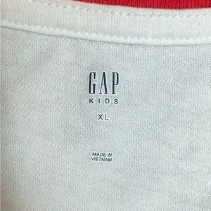 This classic GAP tee features a crisp white base with striking red accents, embodying a timeless ringer style. Perfect for casual outings, its short sleeves and crew neckline offer a comfortable fit, making it a versatile addition to any wardrobe.