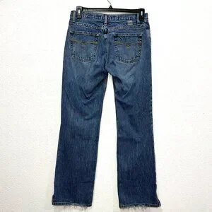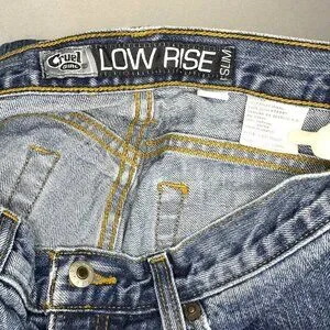 CRUEL GIRL low rise slim jeans, size 11 LONG, distressed hole in one knee, frayed around the bottom of the leg openings.
